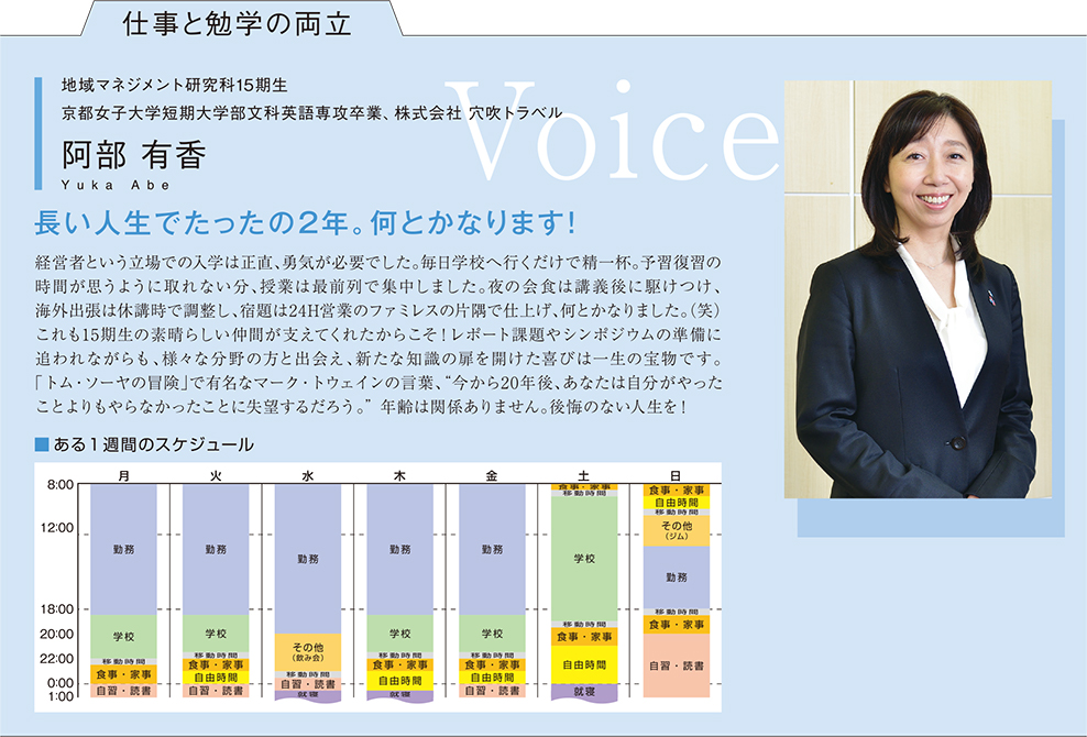 A. 地域マネジメント研究科には、様々な専門知識を有する、あるいは、多種多様な企業経験を持つ方々が集まっています。その中に身を置くことは、その方々と親睦を深め議論を交わし、自分の価値観や知見を広げる大きな機会だと考えています。