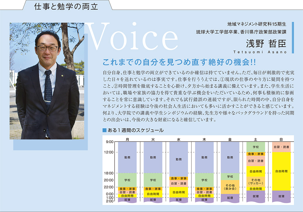 これまでの公務員人生から一歩広い世界に踏み出したい、ふるさとの地域をこれまでと違った視点で見つめ直したいという想いで、大学院を受験しました。 仕事と勉学の両立は想像以上にハードですが、仕事・家庭のタイムマネジメントを意識して日々の授業に臨んでいます。 大学院で学ぶにあたって、家族の応援が支えとなり、充実した学生生活を送ることができています。