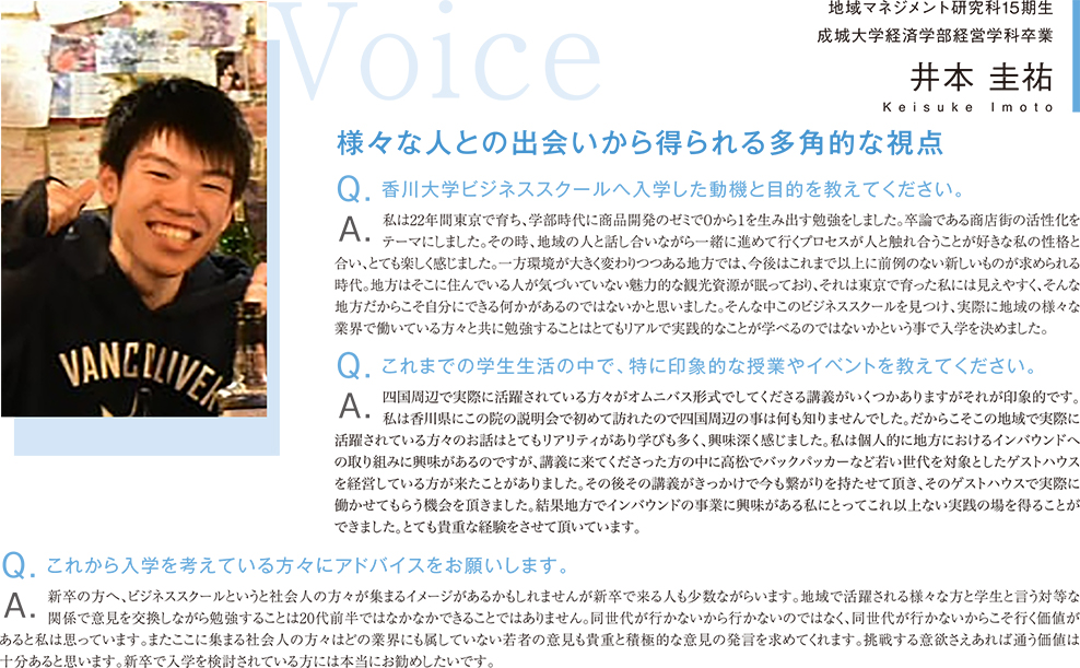 A. 出身地である善通寺市の市役所の方から「市の衰退が激しい」との話があり、「どうにか市を活性化させよう!」と話をしたのがきっかけで地域活性化に関心を持ちました。 しかし、自分には地域活性化に関する知識はありません。どこかで学べないかと探したところ、香川大学ビジネススクールで地域活性化の勉強ができると分かったので入学しました。