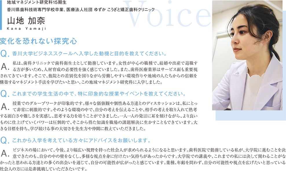 A.地域医療を担う者として、「どうすれば地域を活性化できるのか?」と考えるようになり、入学を決心しました。講義を通じて、マネジメントについて総合的に深く学び、地域の未分化で多様な課題を解決していきたいと考えています。また地域マネジメント研究科では、同じように地域の課題に向き合う“仲間”を見つけたいと思っています。